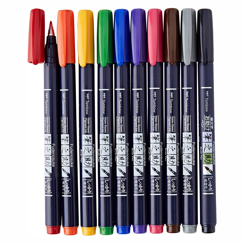 Mit elastischer Spitze für Variabilität in der Strichbreite - von sehr fein bis breit. Wasserbasierte Pigmenttinte. Alle 10 Farben in einem Set.
